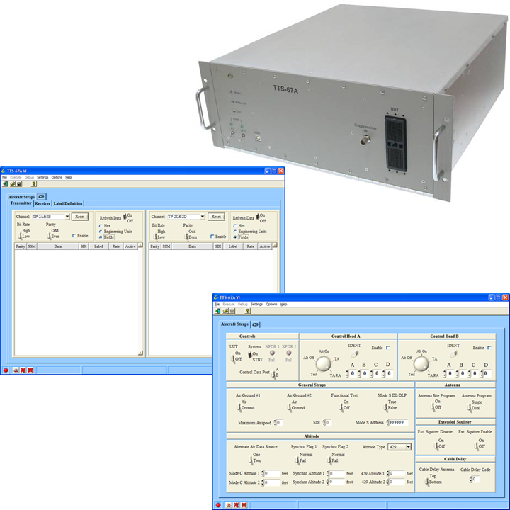The TTS-67A provides aircraft stimulus for an ARINC 718 Mode S Transponder. A Windows based User Interface software provides capability of controlling all resources in the test set manually. The User Interface allows generation of test scripts by recording the actions on the virtual panels. |